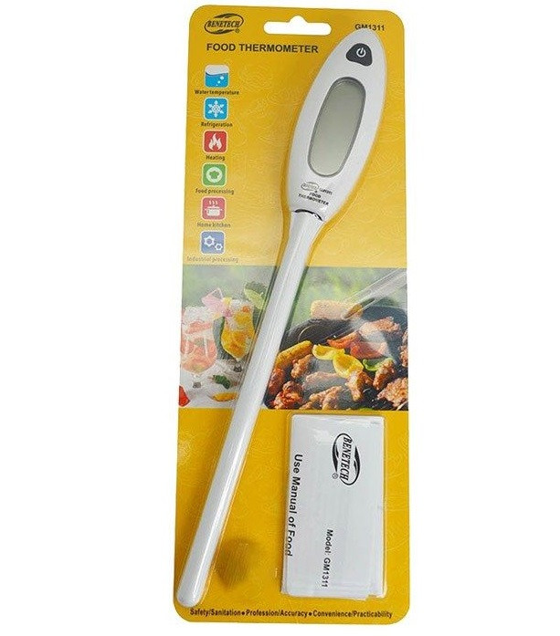 ترمومتر، دماسنج دیجیتال مواد غذایی مدل BENETECH GM1311 یک ترمومتر تماسی نفوذی پرتابل از کمپانی BENETECH می باشد.از ویژگیهای مهم این ترمومتر تماسی مواد غذایی می توان به پراب 15 سانتیمتری جهت سهولت نفوذ به داخل مواد غذایی و صفحه نمایش حدود 2 اینچ اشاره کرد.مواد کاربرد دماسنج تماسی مواد غذایی GM1311 بسیار گسترده می باشد. این دماسنج دیجیتال می تواند در فرآیند پخت مواد غذایی در کارخانه های صنایغ غذایی ، در آشپزخانه های صنعتی (مانند رستوران ها و کیترینگ های بزرگ) و آشپزخانه شخصی مورد استفاده قرار بگیرد.