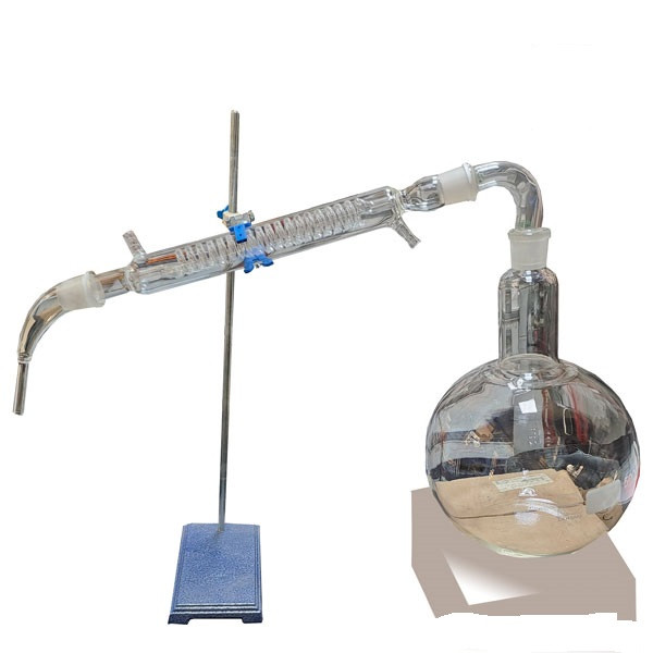کولر (Condenser): لولهای شیشهای که بخارهای داغ وارد آن شده و به مایع تبدیل میشود. معمولاً به صورت دو لایه است که لایه خارجی برای عبور آب سرد و لایه داخلی برای انتقال بخار به مایع استفاده میشود.